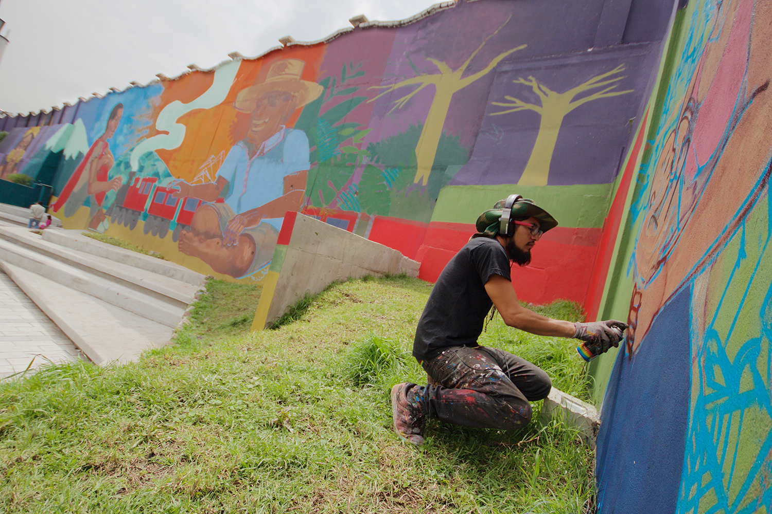 Hace un par de horas seguía al pie del cañón. Cuando cotizó el muro para el Municipio, el contrato quedó en 400 metros. Él no se quiso quedar con la pica y viendo que le regalaban el lienzo se atrevió a pintar por encima del bordillo que hacía de margen superior, además de las gradas y las jardineras. Cree que todo eso suma unos 100 metros más. Quisiera poder proteger su progreso del ataque de la lluvia cada tarde, pero el presupuesto que le asignaron no alcanzaría para contratar un plástico del tamaño necesario, y el camión que tendría que transportarlo. Estos retos le han mostrado que esta vez no solo se trata de plasmar una idea suya en la pared. Ahora es cabeza de un proyecto, contrata asistentes, alquila una grúa mecánica para alcanzar las partes altas del muro. Él es la cara de la obra.