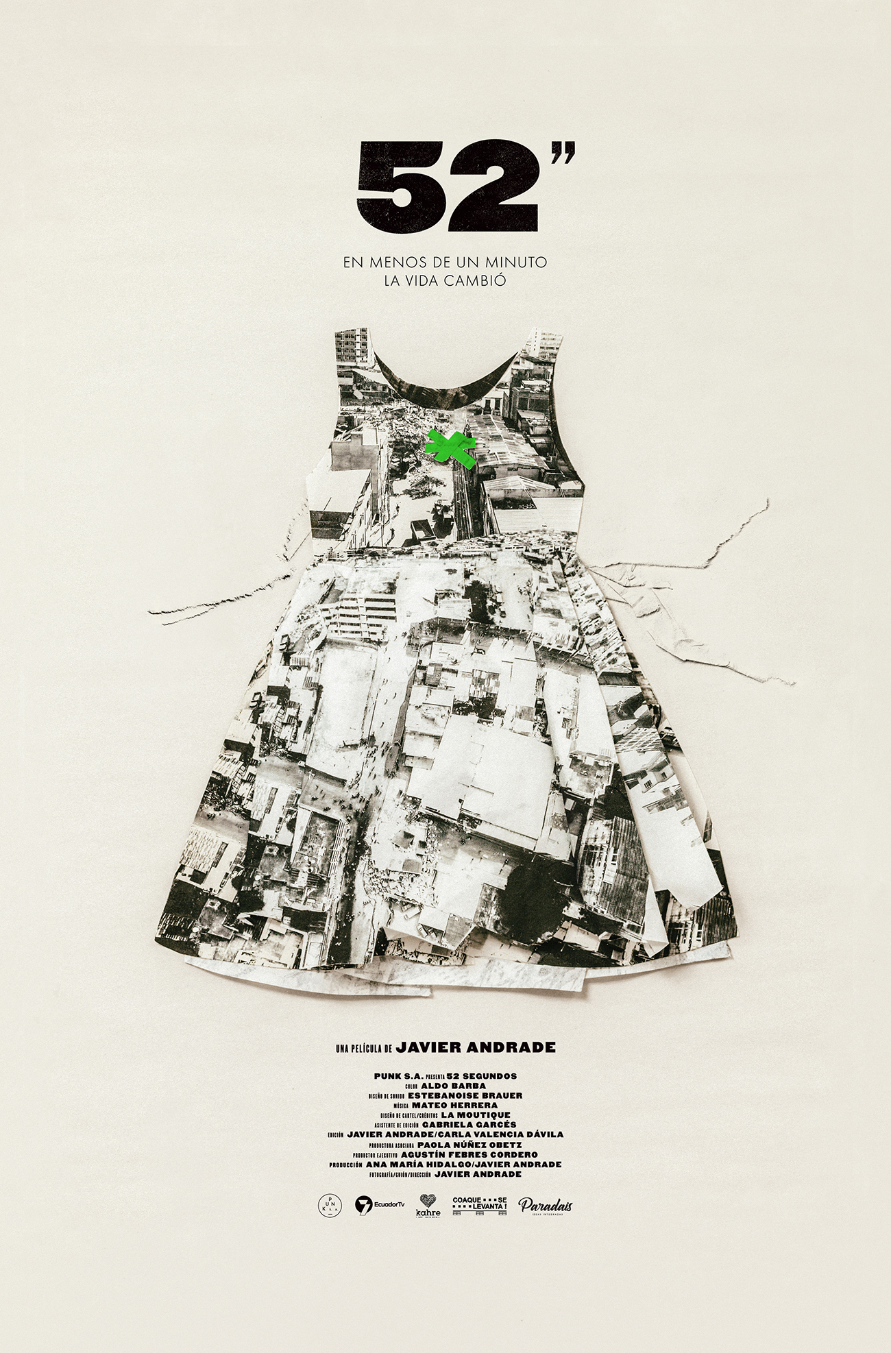Manabí fue la provincia más afectada por el sacudón. Portoviejo, una de las ciudades que más sufrió sus consecuencias. Javier Andrade (Director de las películas Mejor No Hablar de Ciertas Cosas, La Casa del Ritmo), no pudo darle la espalda al lugar donde creció, y desde Quito, se fue corriendo con una cámara para registrar algo de la vida que quedaba entre los escombros. El resultado fue un documental: 52» (cincuenta y dos segundos).