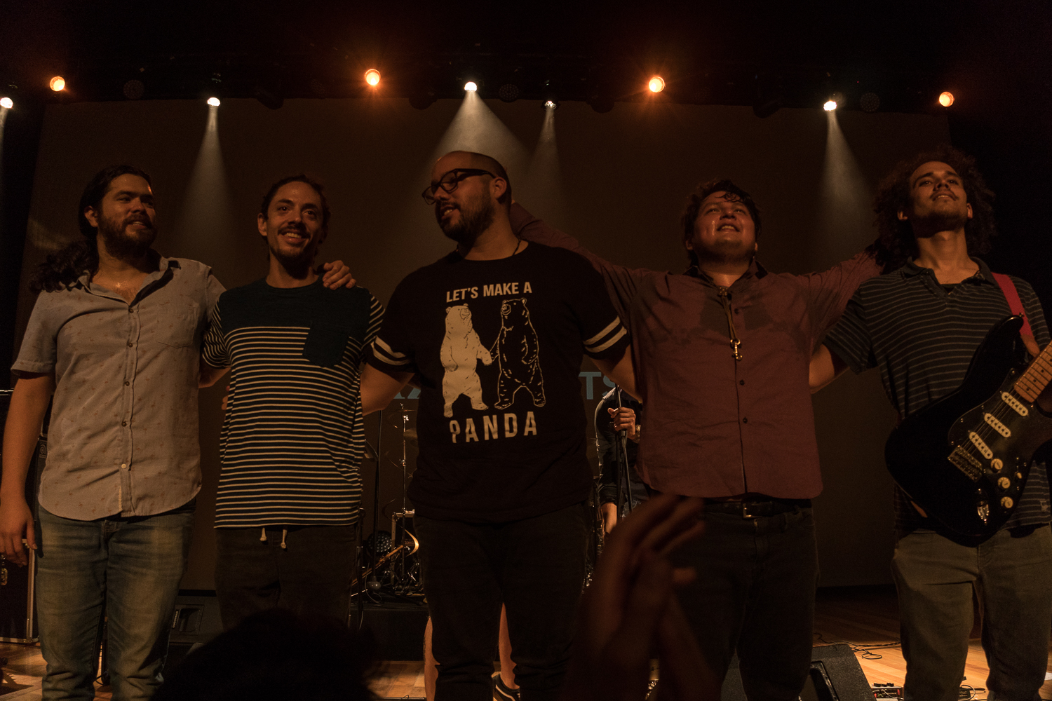 Raúl hace parecer que la precisión es un acto de magia que no requiere esfuerzo. Gabriel tiene la mirada siempre altiva y las orejas bien afiladas para puntear la guitarra. Lord baila por el escenario cuando su saxofón está en silencio, y se deja ir entero en los soplidos cuando le corresponde. Ismael es como una banda elástica en tensión que contiene el fondo de todo el sonido. Miguel es como un niño. Su energía alborotada y ligera desborda en muecas que se traducen de su rostro a sus dedos y viceversa.