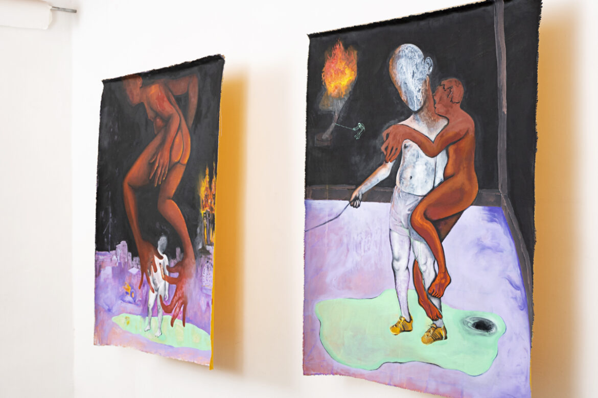 Así que el hecho de que las pinturas estén solamente en el lienzo es mucho más fácil. Si las tengo que vender a alguien o mudarme a un lugar, sólo las enrollo y me las llevo. Pero, aparte de eso, el efecto que crea el lienzo suelto es el de un cuerpo frágil, fácil de arrancar y que se mueve con el viento si alguien abre o cierra la puerta. El medio en que las pinturas se muestran, creo, tiene un diálogo interesante con los cuerpos y las narrativas que suceden dentro de los cuadros.