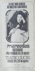 La primera visita de Mercedes Sosa a Ecuador se dio en 1975, se presentó en el Teatro Nacional Sucre y le dio a Polo Barriga, de Revista Nueva, una entrevista en la que se lee: