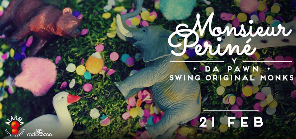 La productora Alarma presenta un evento que miles de personas esperaban desde hace mucho tiempo: la llegada de Monsieur Periné con su suin a la colombiana al Ecuador. El 21 de febrero a las19h00 se presentará en Quito en compañía de los Swing Original Monks, Da Pawn y Lolabúm, bandas de música alternativa local.