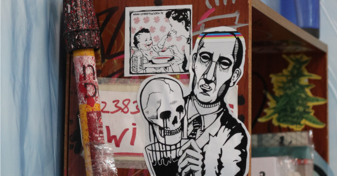 Juan Pablo Valle (aka Ache o HTM) es un artista urbano que, junto a Pamela Pinto —diseñadora y entusiasta del collage digital—, decidió poner en marcha un espacio creativo para la promoción del arte urbano en la ciudad. Este lugar apenas lleva funcionando poco más de dos meses desde que se acabó de cuajar el concepto, con la coalición de dos personas que quizá nunca se imaginaron trabajar juntas. Juan Pablo cuenta que el encuentro con Pamela fue muy casual y algo inesperado. Pero también admite que sin ella hoy el Nudo no sería lo que es.