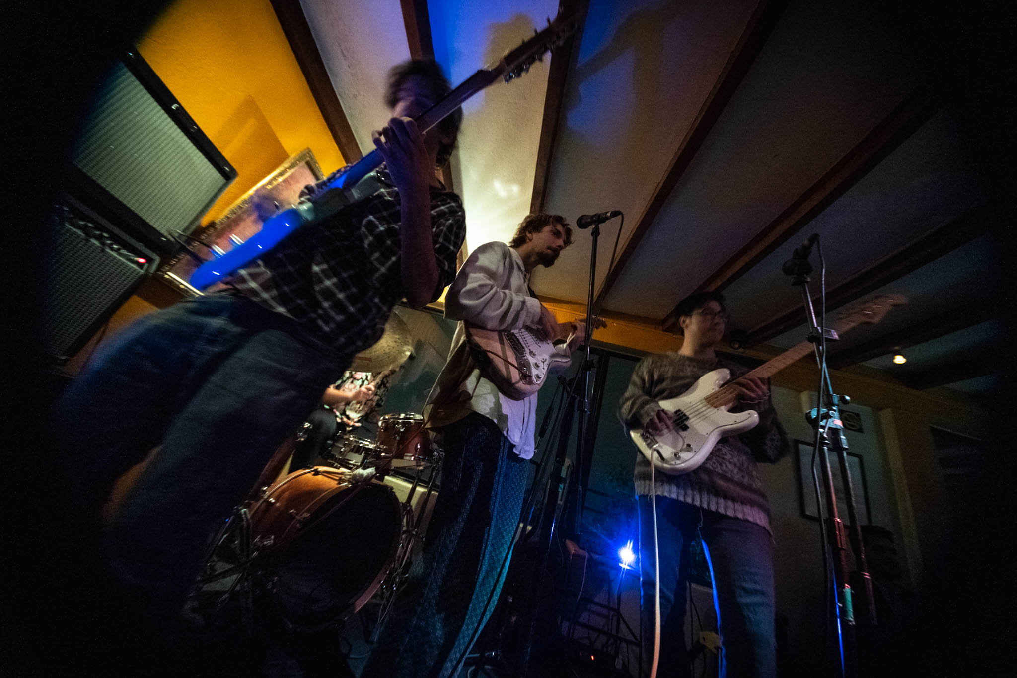 Los músicos esperaban afuera intentando disimular la ansiedad previa al toque con conversaciones en spanglish y saludos efusivos a cada persona que veían llegar. Era bacán verlos, porque se notaba que estaban genuinamente emocionados, que era una sorpresa grata tener a tantas personas reunidas en su toque. Entre ellos se paseaba el gringo “homenajeado”: Blaise. Entraba y salía con una sonrisa de esas que tienen los que nunca saben bien qué están haciendo pero que caen bien a todo el mundo porque son simpáticos. Sus cómplices en la movida eran Nicolás Larrea (guitarrista), Fabián Navarrete (batería) y Mati Xavier Olivo (bajo).